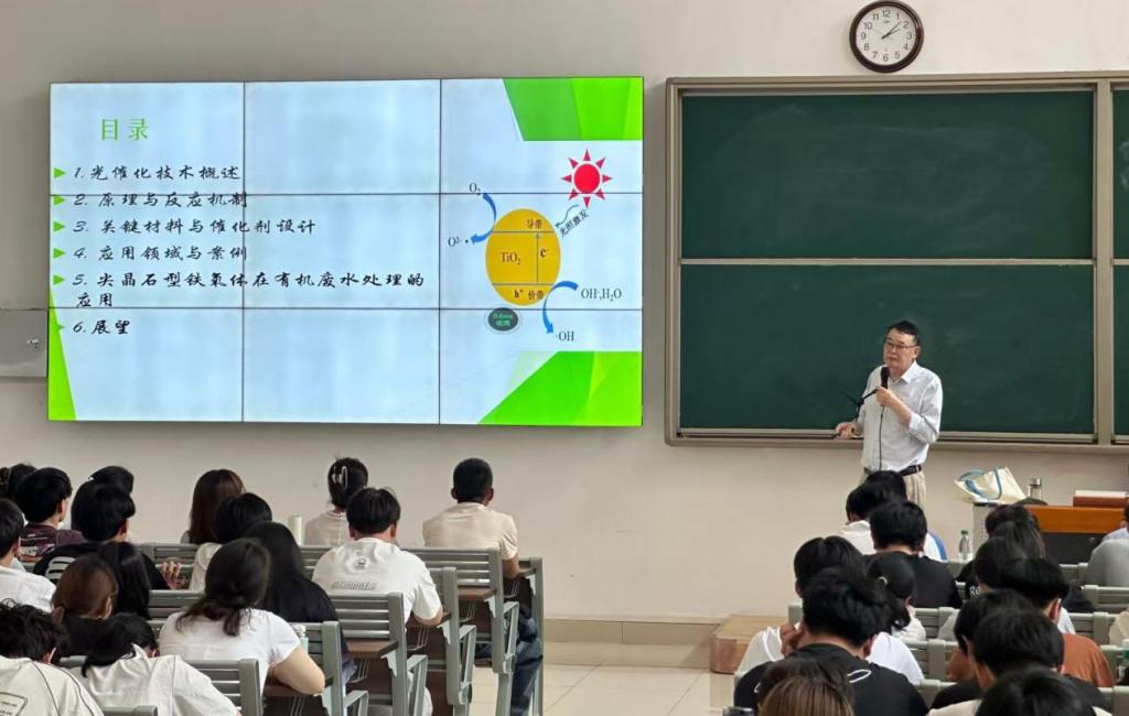 报告中,陈士昆教授结合自己及其科研团队在光催化氧化领域的最新成果,系统阐述了三个方面的内容,一是光催化氧化核心技术瓶颈(如宽谱光吸收、活性位点调控)与突破路径;二是典型污染物(甲基橙、亚甲基蓝、罗丹明B)的光催化降解机制与应用案例;三是光催化技术产业化挑战与解决方案(如催化剂寿命、成本控制等)。报告内容既有知识科普,又有学术研究。通过理论深度与实践广度的结合,为广大师生呈现了光催化氧化技术的前沿动态与未来展望。