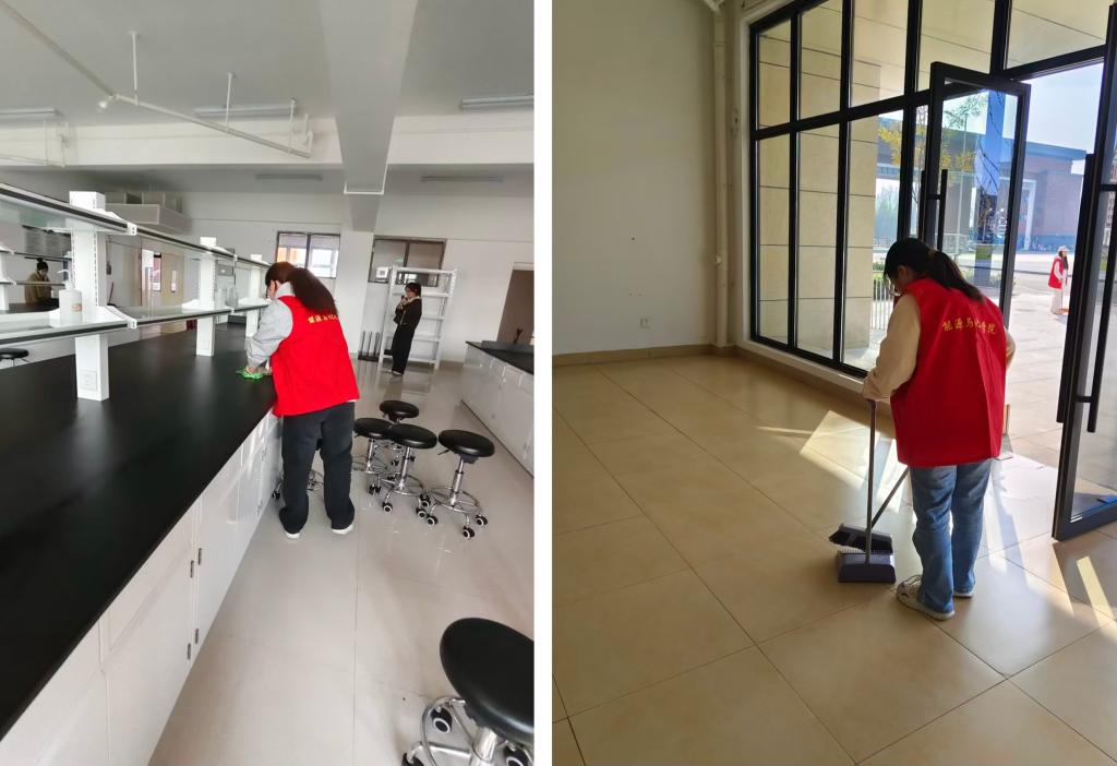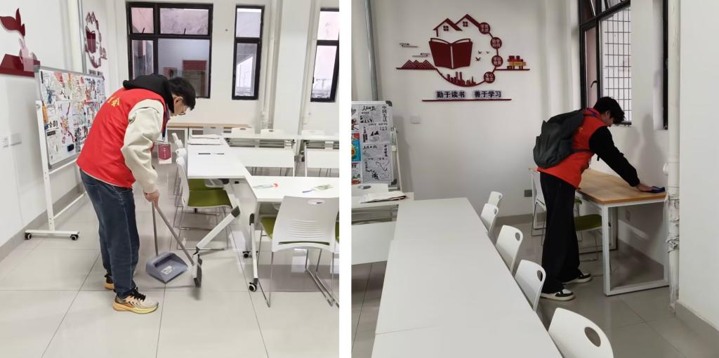 一站式员工社区内,志愿服务同样热火朝天。志愿者们分工清扫楼道走廊、公共活动室等区域,用扫帚清扫地面杂物,重点清理墙角缝隙、桌椅底部等卫生死角。另有学员化身“文明倡导员”,张贴“随手归位”“文明共享”等温馨提示卡,引导同学们共同维护社区环境。经过数小时奋战,社区公共区域焕然一新,为师生打造了整洁舒适的活动空间。