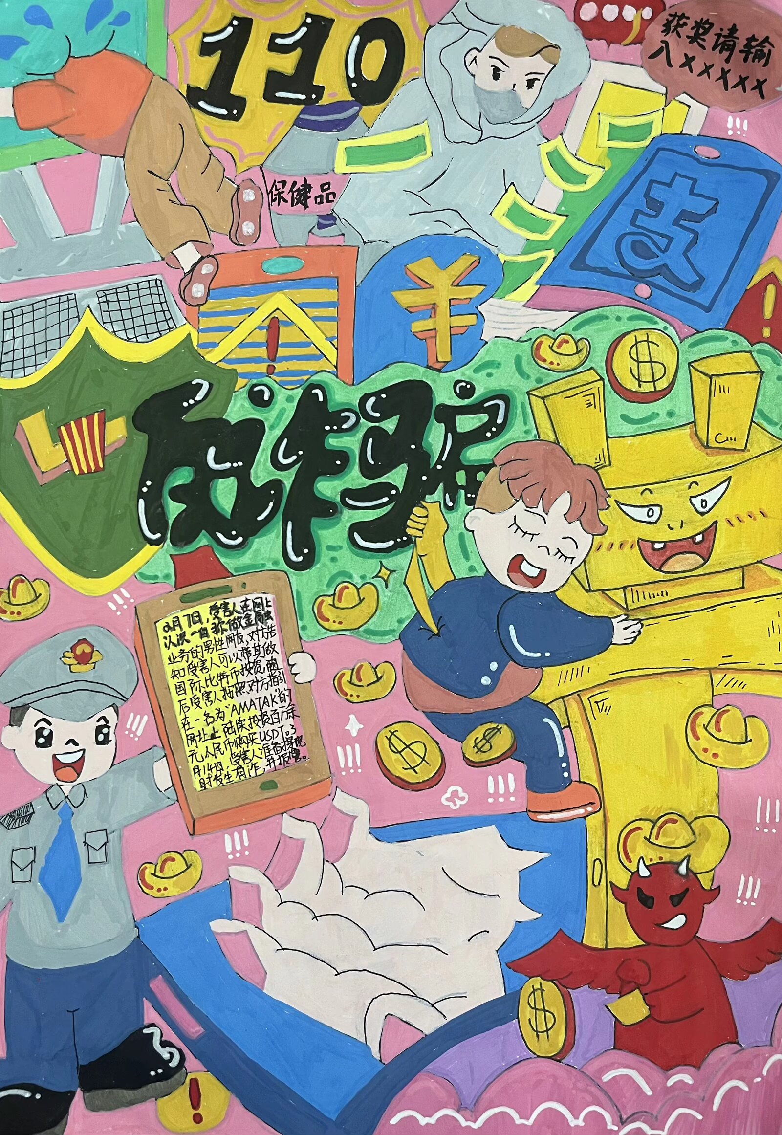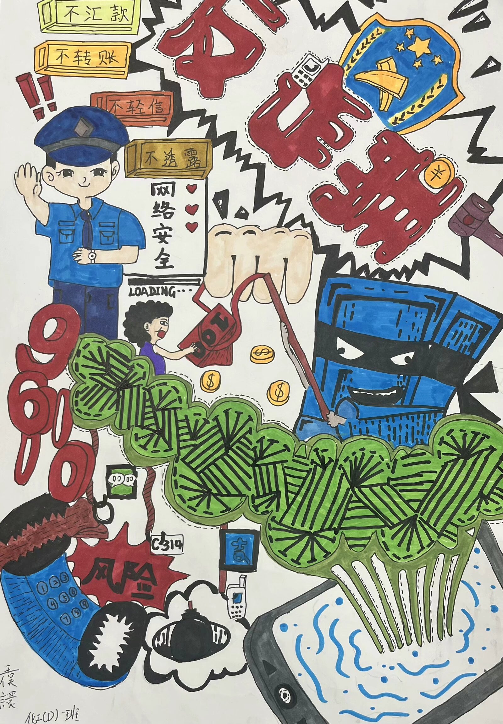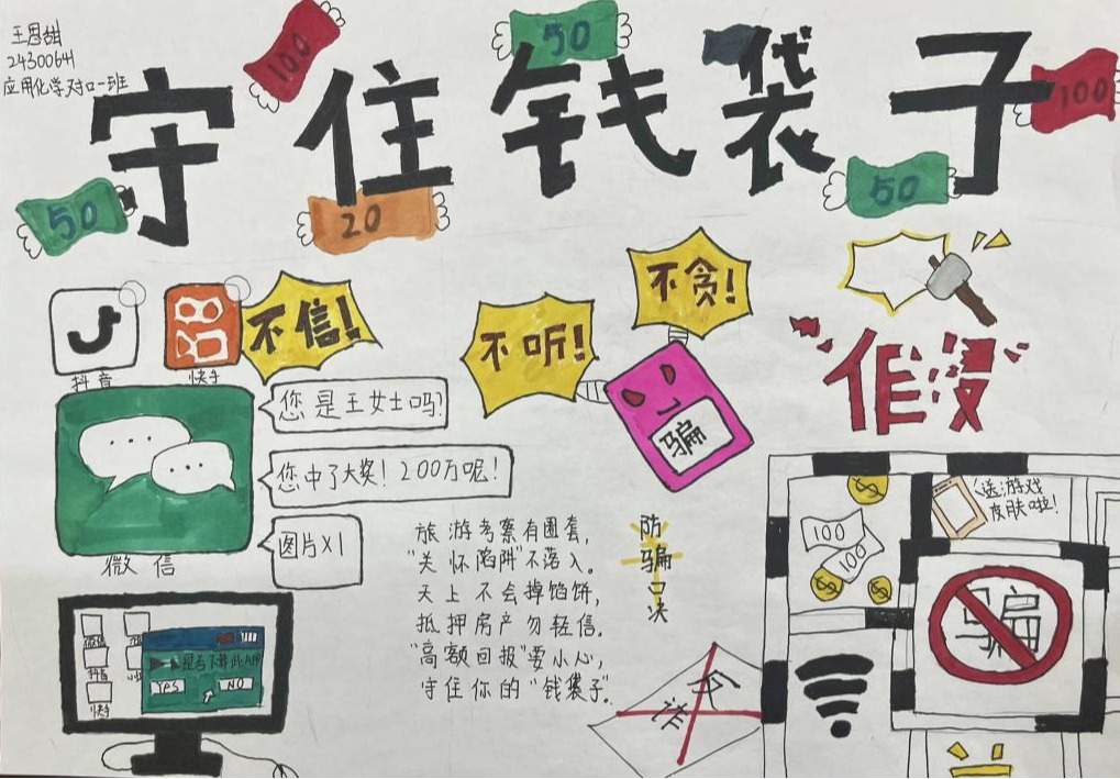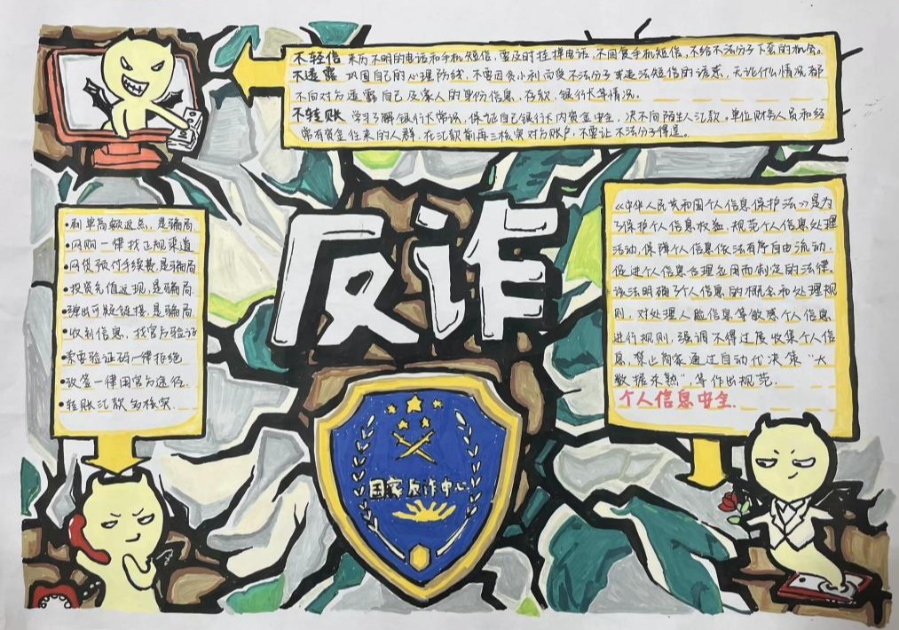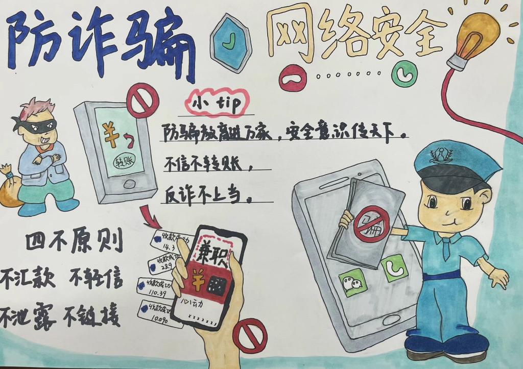 参赛作品中,有的通过生动形象的漫画,描绘出网络诈骗的常见场景,如虚假网络兼职、电信诈骗等,用幽默诙谐的方式揭示诈骗分子的惯用伎俩;有的则以细腻的笔触绘制海报,配上醒目的反诈标语,呼吁大家提高警惕,守护好自己的财产安全。每一幅作品都饱含着同学们对反诈事业的热情和对校园安全的关注,以艺术的感染力传递着反诈防骗的重要信息。