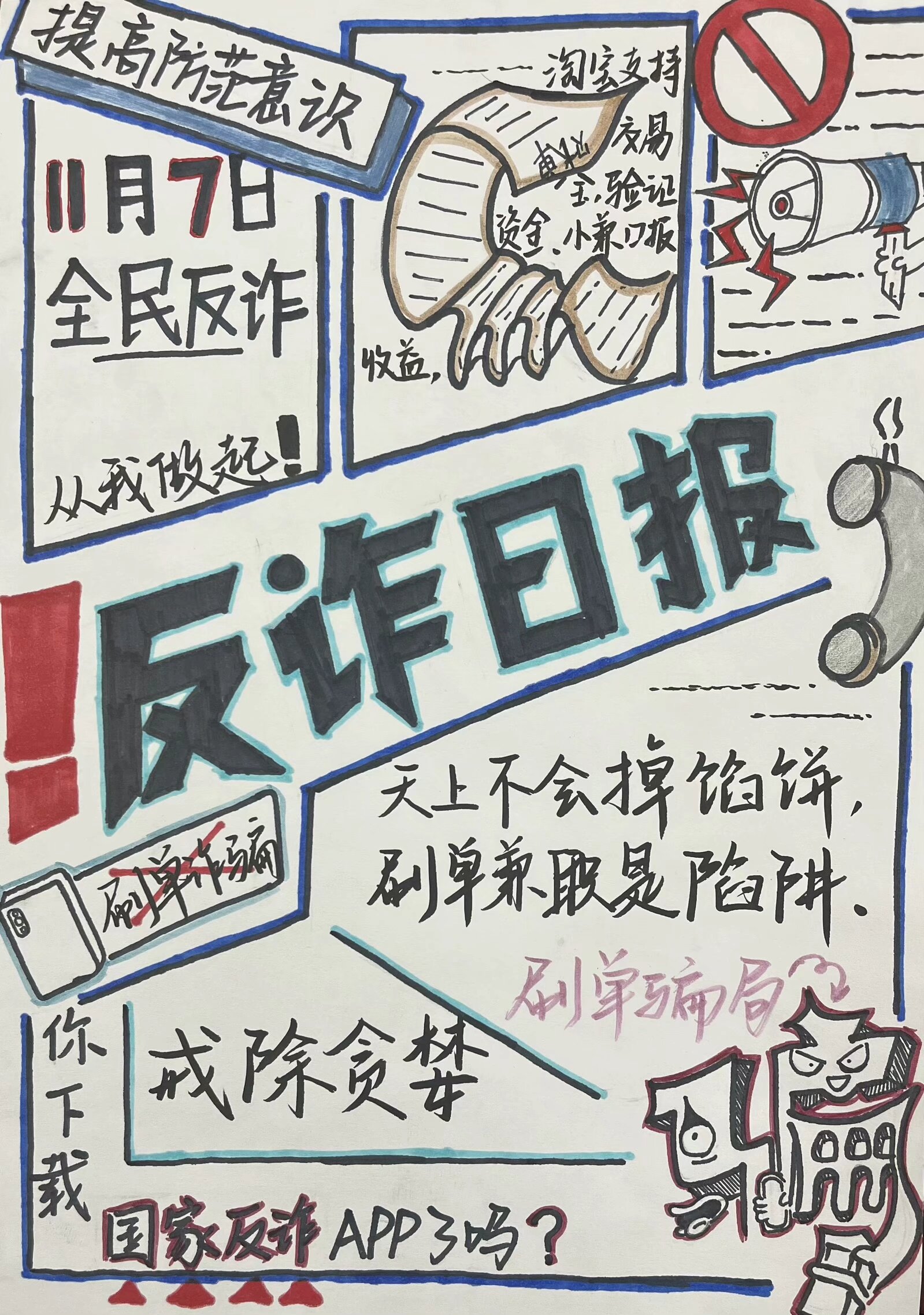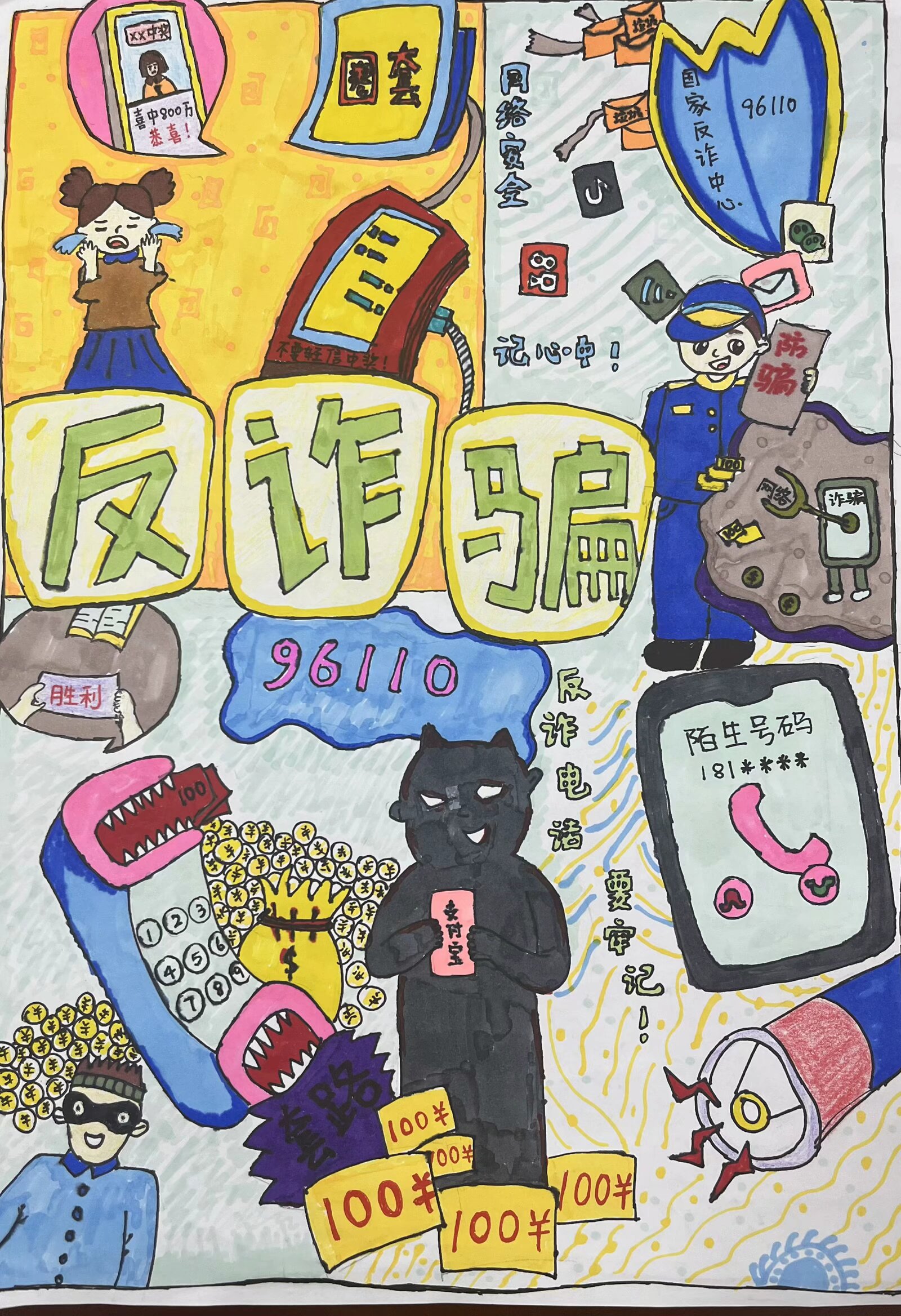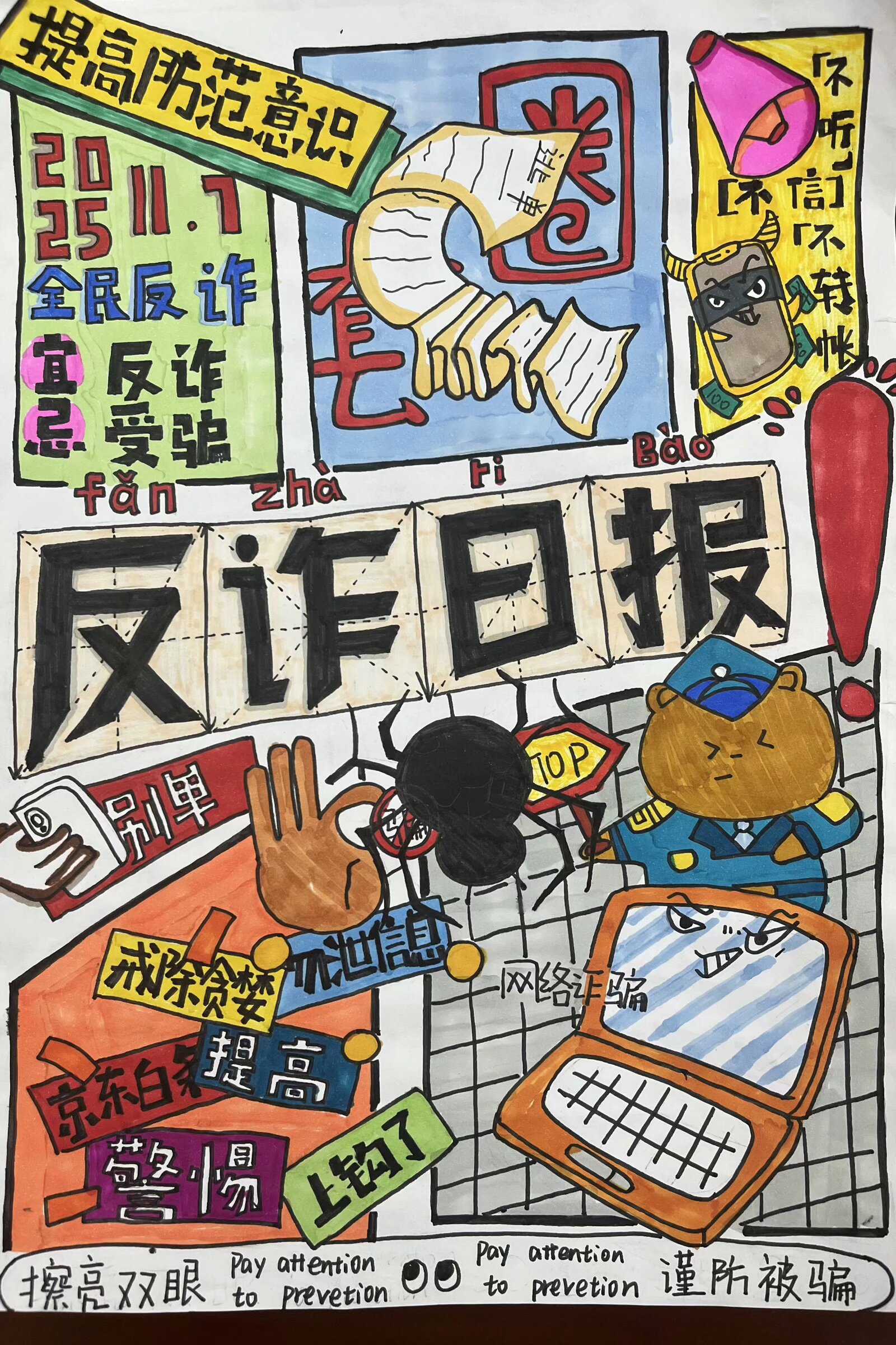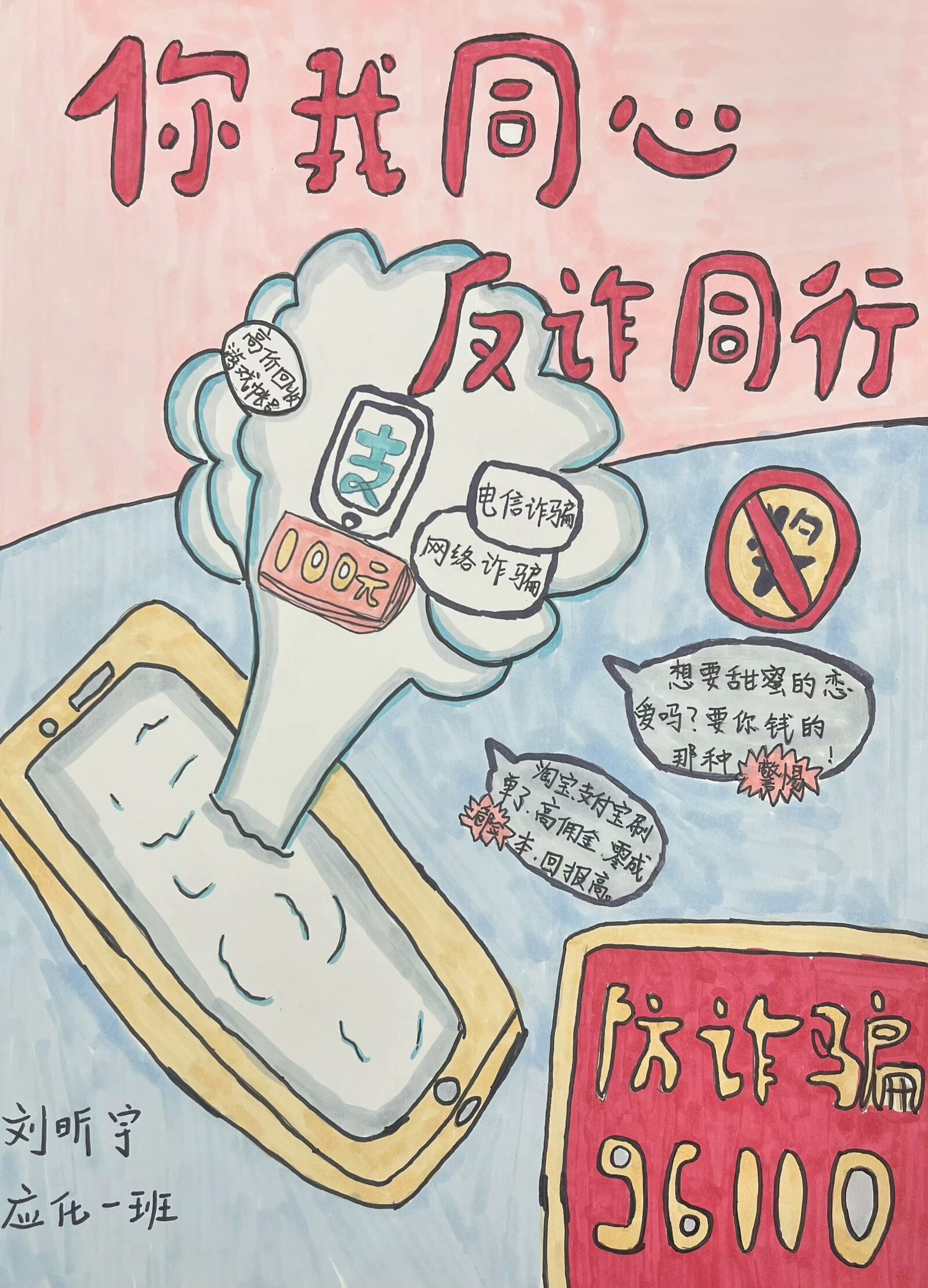 参赛作品中,有的通过生动形象的漫画,描绘出网络诈骗的常见场景,如虚假网络兼职、电信诈骗等,用幽默诙谐的方式揭示诈骗分子的惯用伎俩;有的则以细腻的笔触绘制海报,配上醒目的反诈标语,呼吁大家提高警惕,守护好自己的财产安全。每一幅作品都饱含着同学们对反诈事业的热情和对校园安全的关注,以艺术的感染力传递着反诈防骗的重要信息。