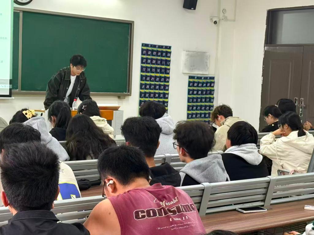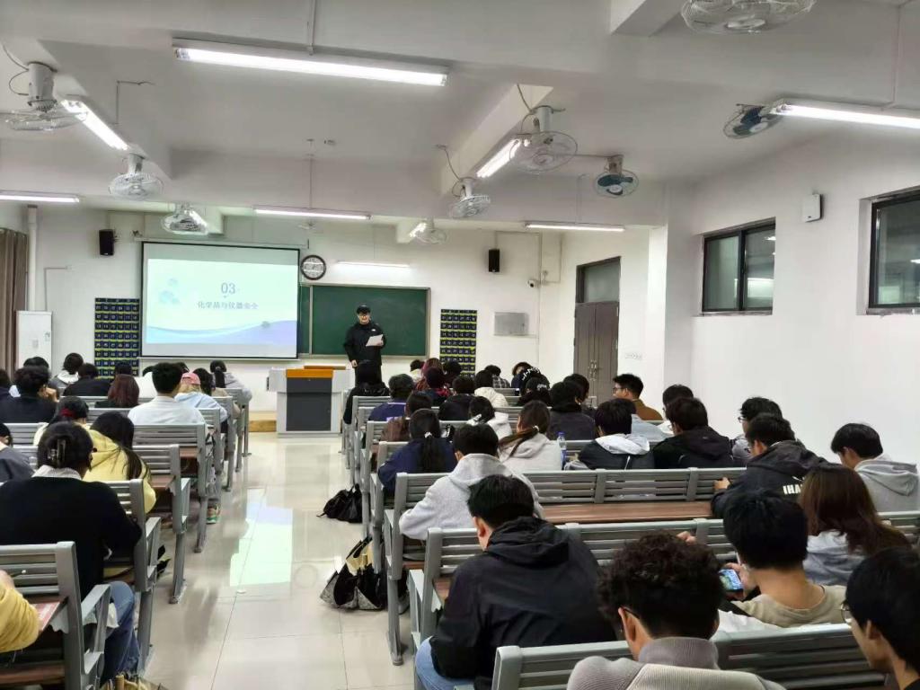 此次讲座由社团骨干成员策划,社团指导老师王振国指导开展。活动中,社团骨干成员结合自身实验经验,围绕“实验室基本安全守则”“危险化学品分类与储存”“个人防护装备使用”“应急处理措施”等多个方面,进行了系统而生动的讲解。通过真实案例分析、图文展示与互动问答,将枯燥的规章制度转化为易于理解、记忆深刻的安全知识。同时王振国针对讲座内容的专业性、实用性提出优化建议,确保每一个知识点都能精准贴合新生实验学习需求。互动问答环节,新生踊跃提问,针对“不同浓度硫酸的使用差异”“实验废弃物分类标准”等问题,社团成员与老师给予耐心解答,现场氛围热烈。